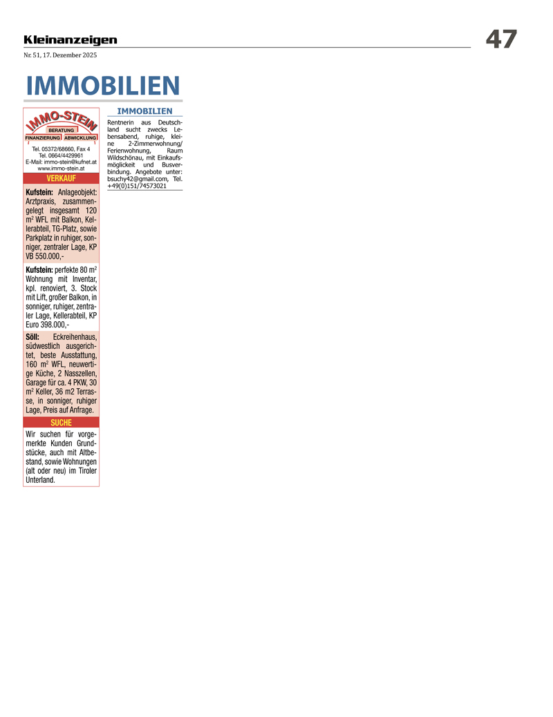 Der Kufsteinblick ist seit 2008 der ideale und zuverlässige Partner für Ihre Immobilienanzeigen im Bezirk Kufstein. Bei Interesse (auch bei Inseraten oder PR-Artikeln) wenden Sie sich bitte an Tel. +43/676/4204444 oder Diese E-Mail-Adresse ist vor Spambots geschützt! Zur Anzeige muss JavaScript eingeschaltet sein!