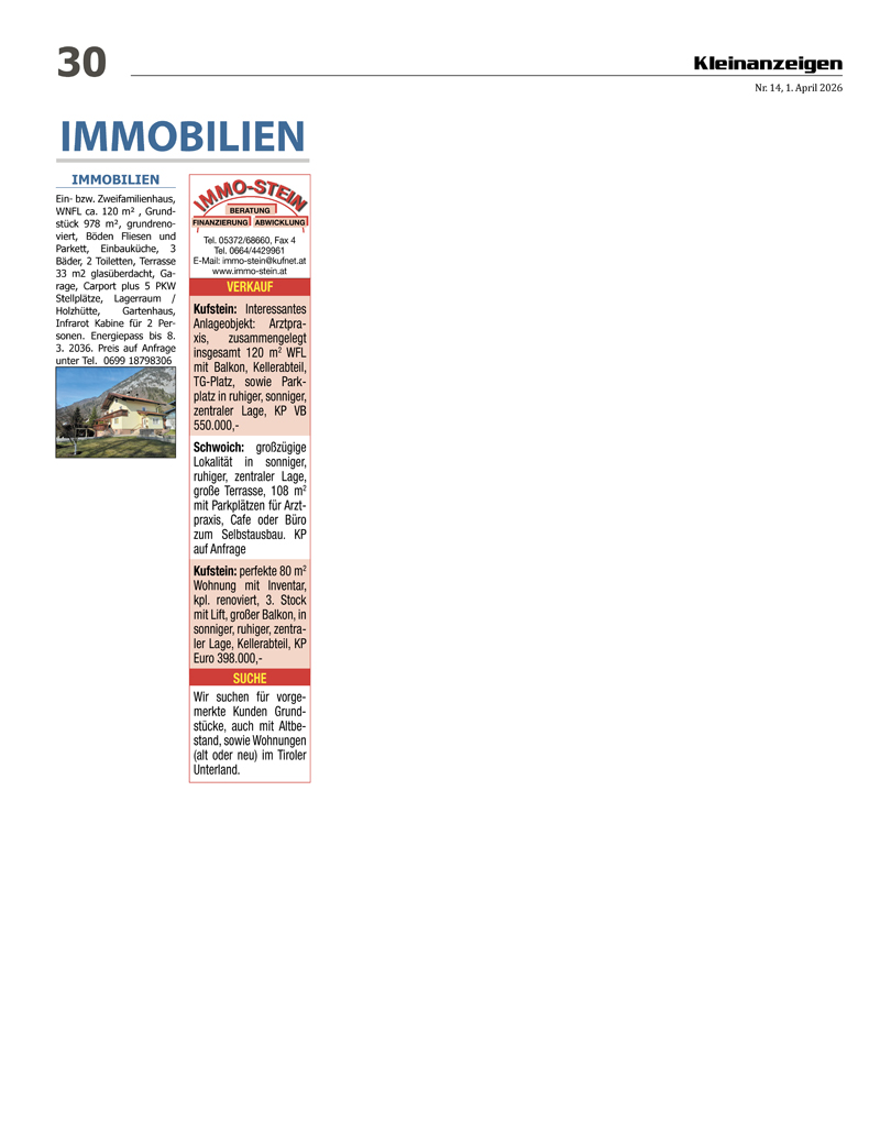 Der Kufsteinblick ist seit 2008 der ideale und zuverlässige Partner für Ihre Immobilienanzeigen im Bezirk Kufstein. Bei Interesse (auch bei Inseraten oder PR-Artikeln) wenden Sie sich bitte an Tel. +43/676/4204444 oder Diese E-Mail-Adresse ist vor Spambots geschützt! Zur Anzeige muss JavaScript eingeschaltet sein!
