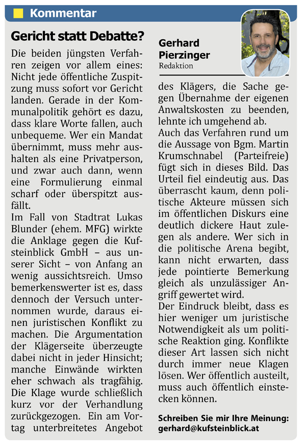 Kufsteinblick-Geschäftsführer Gerhard Pierzinger dazu: „In der Klagschrift argumentiert die Gegenseite mit einer aus ihrer Sicht erhöhten Sorgfaltspflicht. Auch hier galt jedoch die gleiche journalistische Sorgfaltspflicht. Diese wurde nach unserer Auffassung nicht verletzt, und die Berichterstattung über eine politische Auseinandersetzung lag im öffentlichen Interesse. Der Versuch, Stadtrat Blunder als Person ohne öffentlichen Bezug darzustellen, wirkte angesichts seiner politischen Funktion wenig überzeugend.“