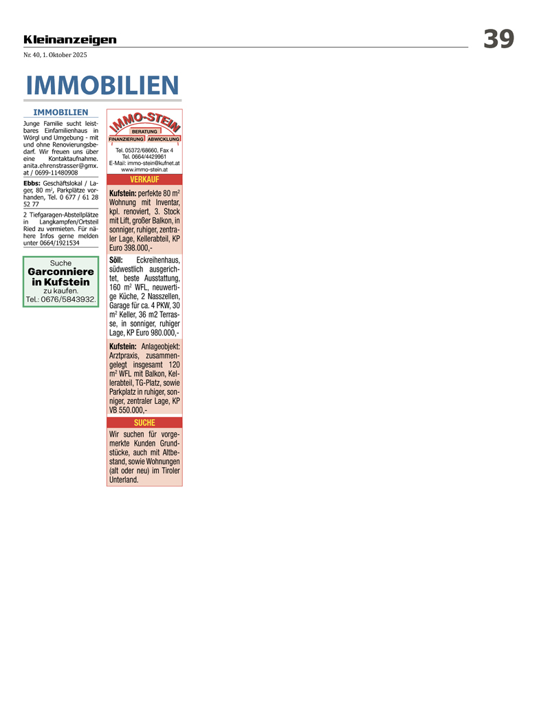 Der Kufsteinblick ist seit 2008 der ideale und zuverlässige Partner für Ihre Immobilienanzeigen im Bezirk Kufstein. Bei Interesse (auch bei Inseraten oder PR-Artikeln) wenden Sie sich bitte an Tel. +43/676/4204444 oder Diese E-Mail-Adresse ist vor Spambots geschützt! Zur Anzeige muss JavaScript eingeschaltet sein!