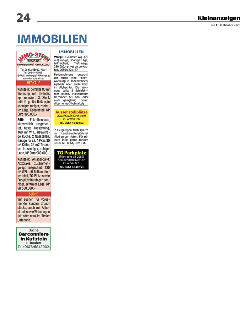 Der Kufsteinblick ist seit 2008 der ideale und zuverlässige Partner für Ihre Immobilienanzeigen im Bezirk Kufstein. Bei Interesse (auch bei Inseraten oder PR-Artikeln) wenden Sie sich bitte an Tel. +43/676/4204444 oder Diese E-Mail-Adresse ist vor Spambots geschützt! Zur Anzeige muss JavaScript eingeschaltet sein!